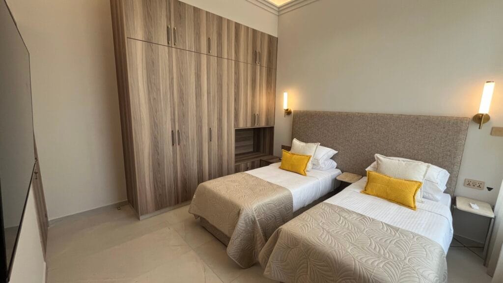 Die Zweibettzimmer im Olymp Luxury Family House bieten eine perfekte Mischung aus Komfort und Eleganz. Durchdacht gestaltet, verfügt jedes Zimmer über zwei kuschelige Einzelbetten, reichlich Stauraum und große Fenster, die den Raum mit natürlichem Licht füllen. Diese Zimmer sind ideal für Gäste oder Kinder und bieten einen ruhigen Rückzugsort mit modernem Dekor und beruhigenden Tönen, die einen erholsamen Aufenthalt garantieren.