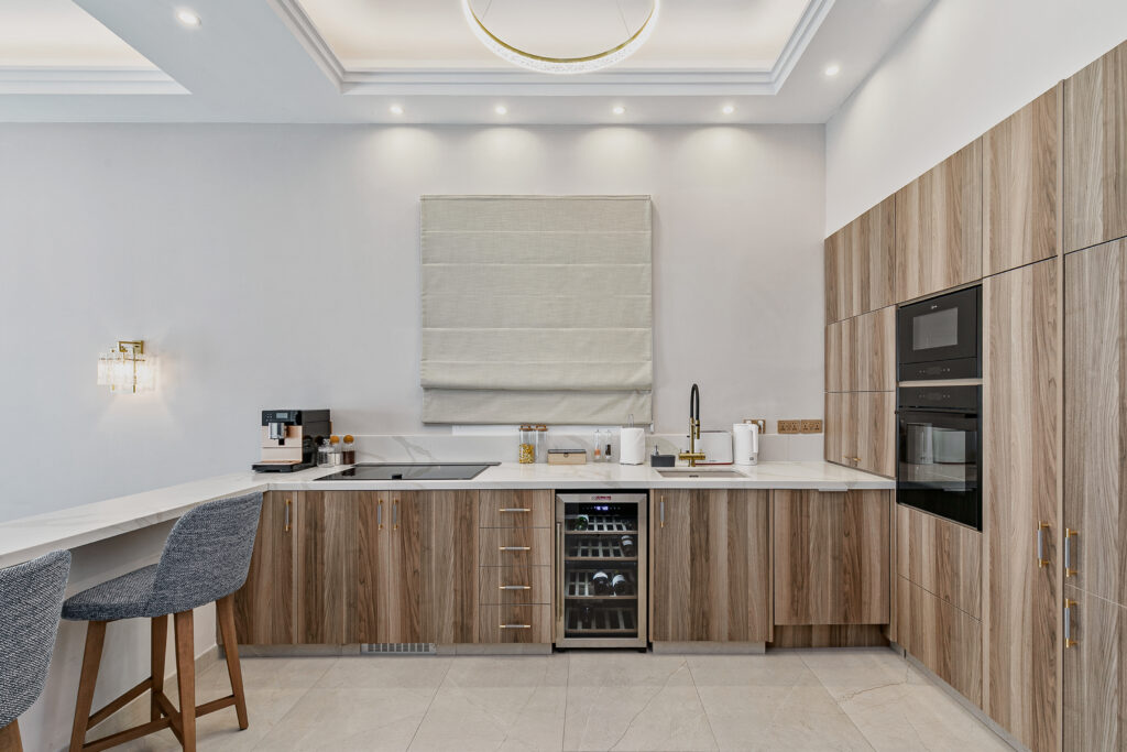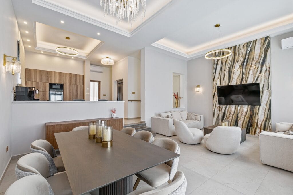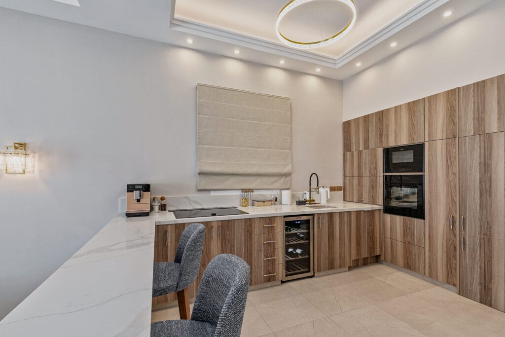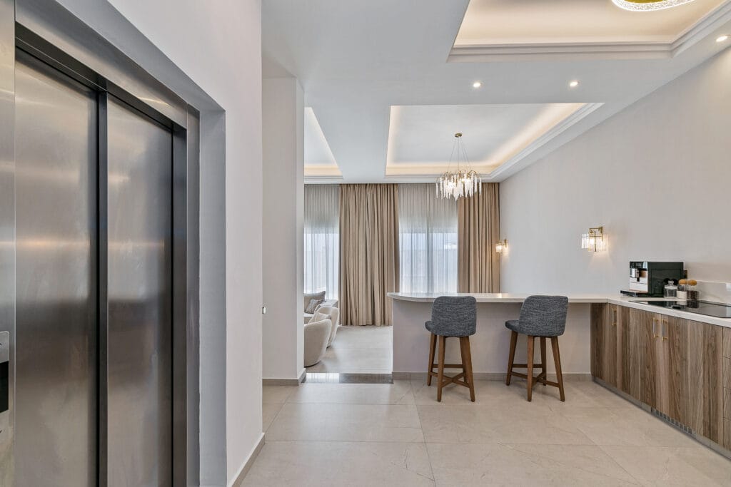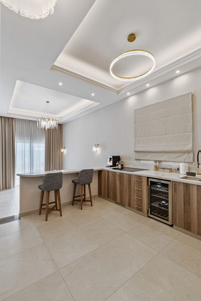 The Olymp Luxury Family House kitchen is a masterpiece of modern design and functionality, featuring premium appliances, marble countertops, and sleek gold accents. Spacious and fully equipped, it’s perfect for culinary creativity, whether for a family feast or an intimate meal. This gourmet kitchen combines style and practicality, seamlessly blending with the home’s sophisticated ambience.