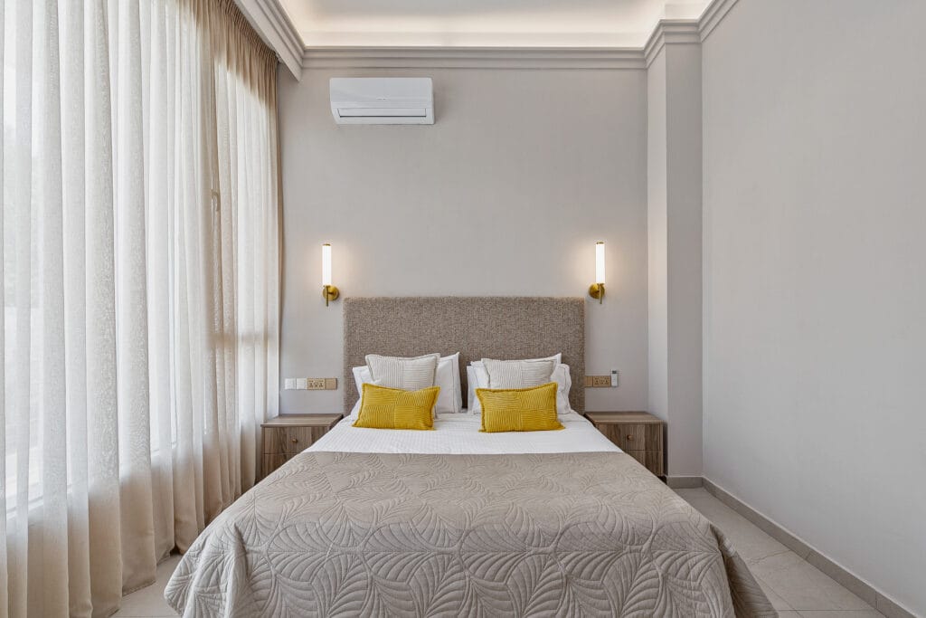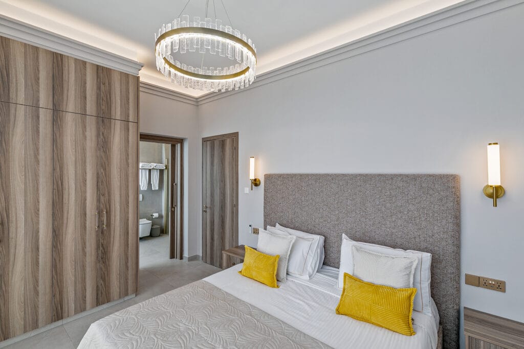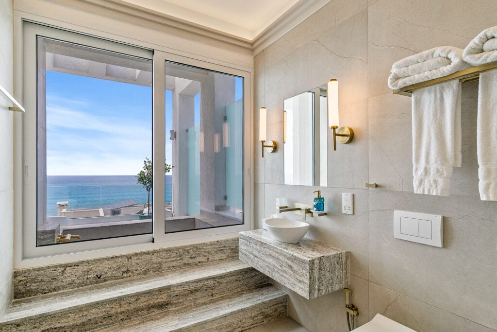 The Seaview Luxe Master is a sanctuary of elegance and tranquillity. Featuring a plush king-sized bed and a private balcony with sweeping Mediterranean views, it’s perfect for savouring morning coffee or sunset wine. The en-suite bathroom boasts marble finishes, a spacious bath, and a shower with breathtaking sea views. Every detail is designed for serene luxury, offering a harmonious blend of natural beauty and refined comfort.