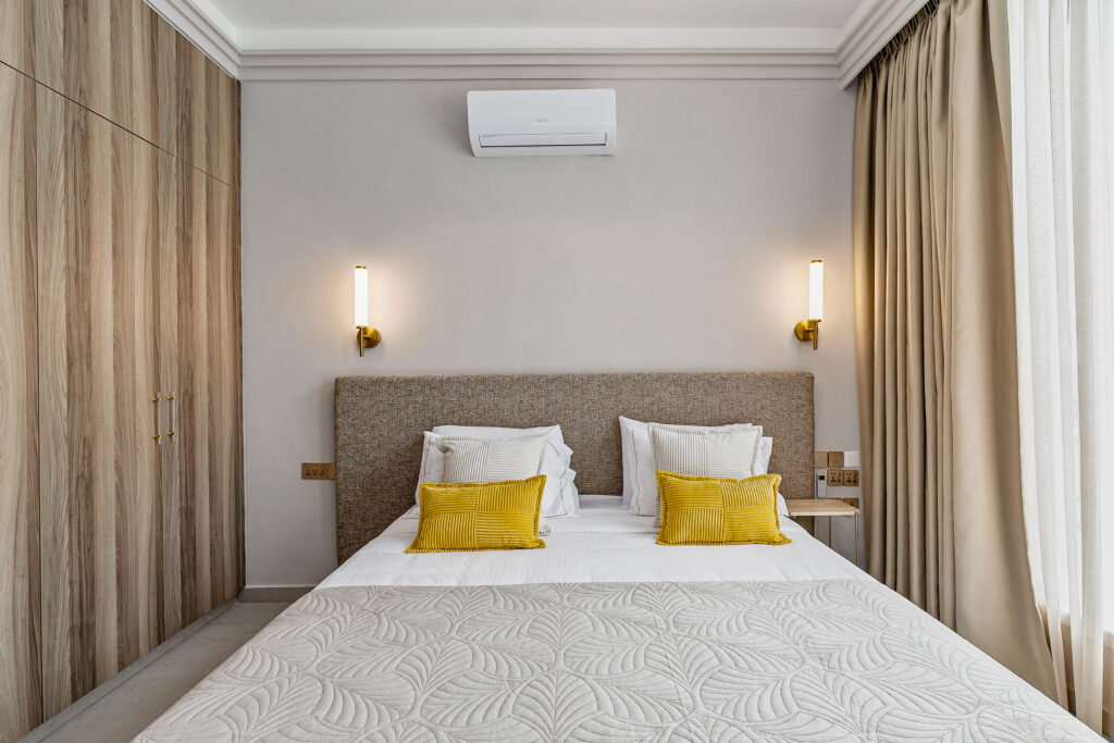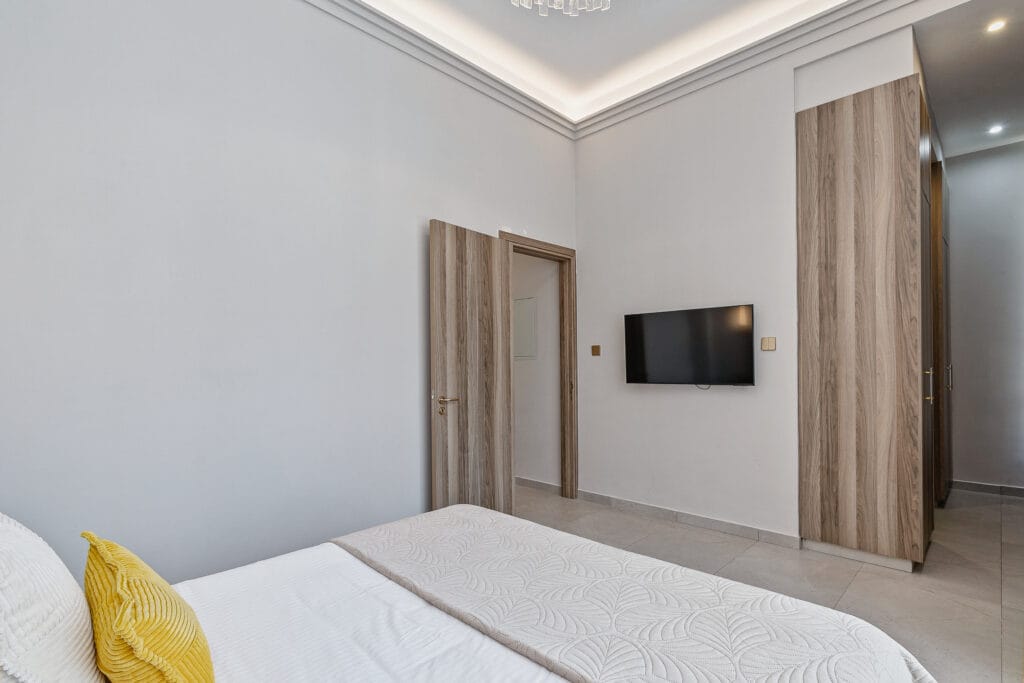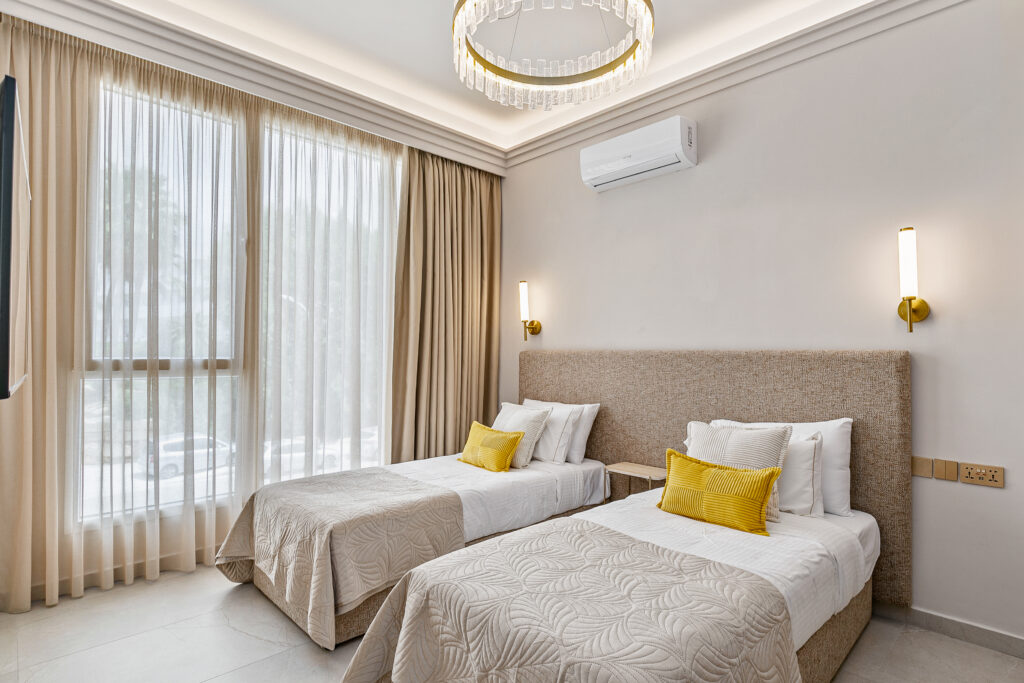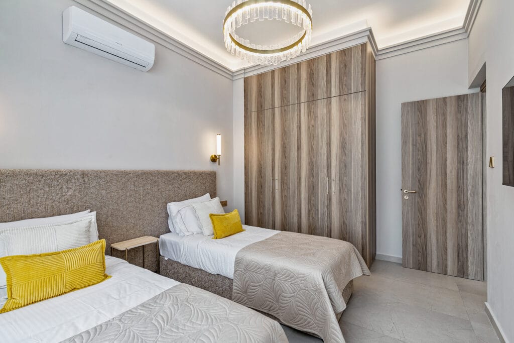 The twin bedrooms in the Olymp Luxury Family House offer a perfect blend of comfort and elegance. Thoughtfully designed, each room features two plush twin beds, ample storage, and large windows that fill the space with natural light. Ideal for guests or children, these bedrooms provide a serene retreat with modern decor and soothing tones, ensuring a restful stay.