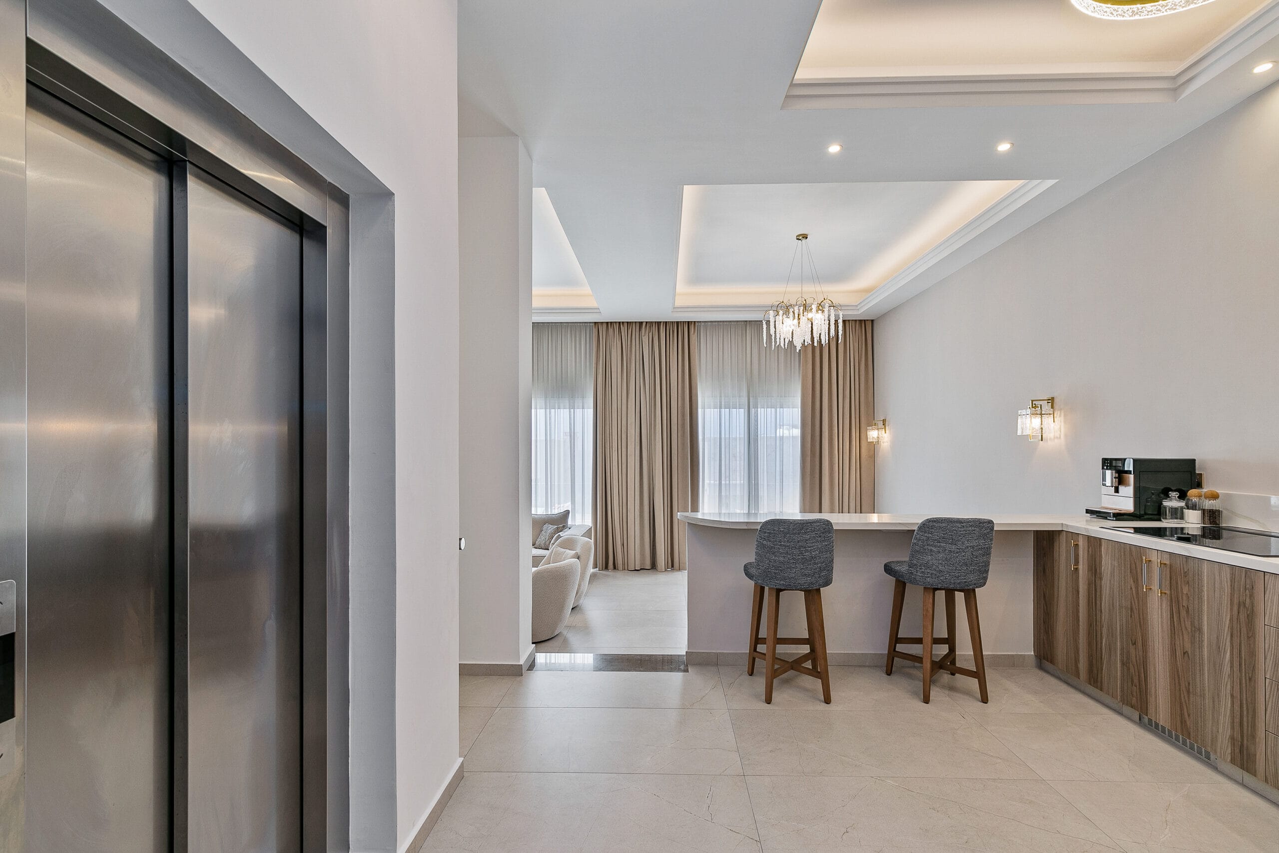 The Olymp Luxury Family House kitchen is a masterpiece of modern design and functionality, featuring premium appliances, marble countertops, and sleek gold accents. Spacious and fully equipped, it’s perfect for culinary creativity, whether for a family feast or an intimate meal. This gourmet kitchen combines style and practicality, seamlessly blending with the home’s sophisticated ambience.
