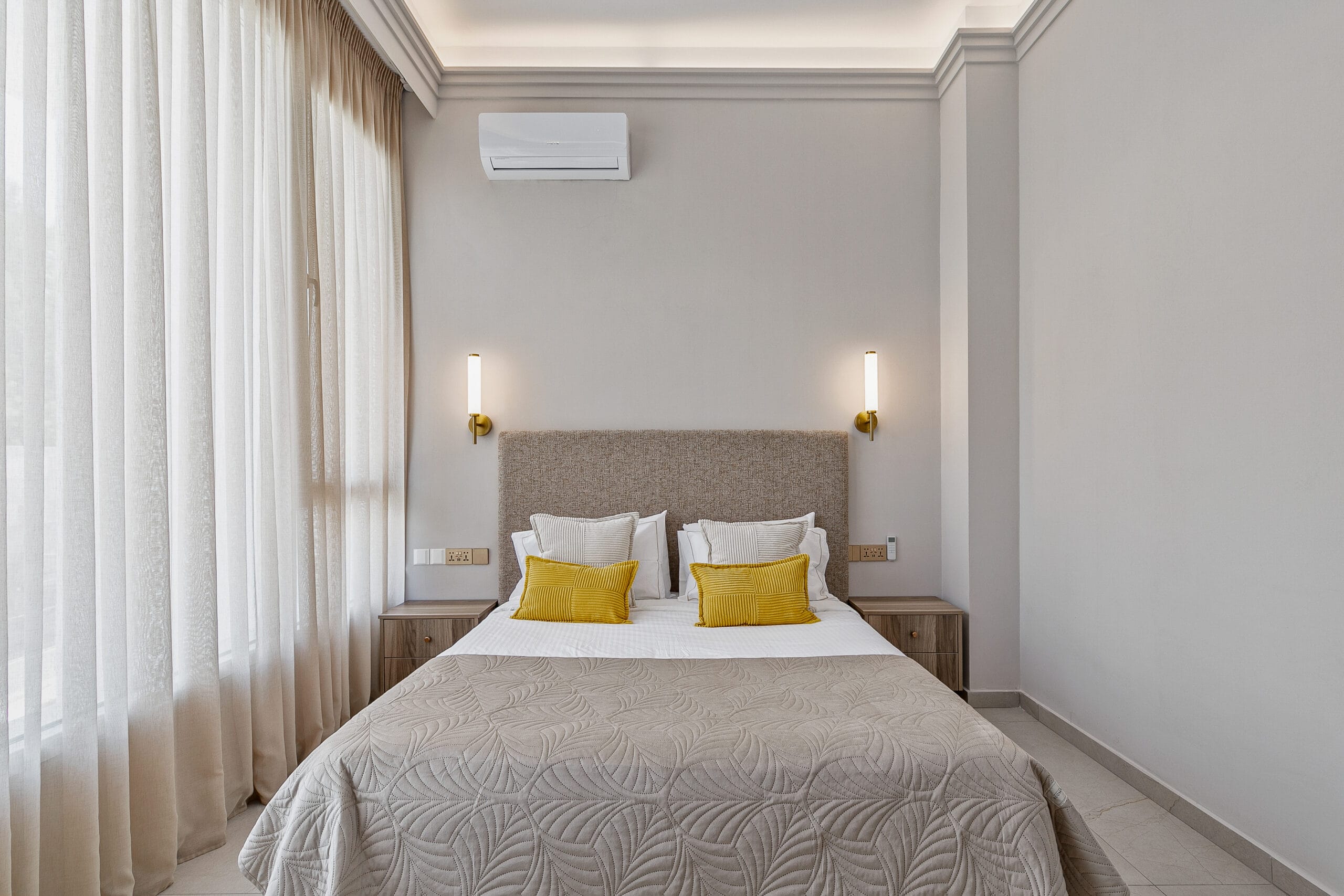The twin bedrooms in the Olymp Luxury Family House offer a perfect blend of comfort and elegance. Thoughtfully designed, each room features two plush twin beds, ample storage, and large windows that fill the space with natural light. Ideal for guests or children, these bedrooms provide a serene retreat with modern decor and soothing tones, ensuring a restful stay.